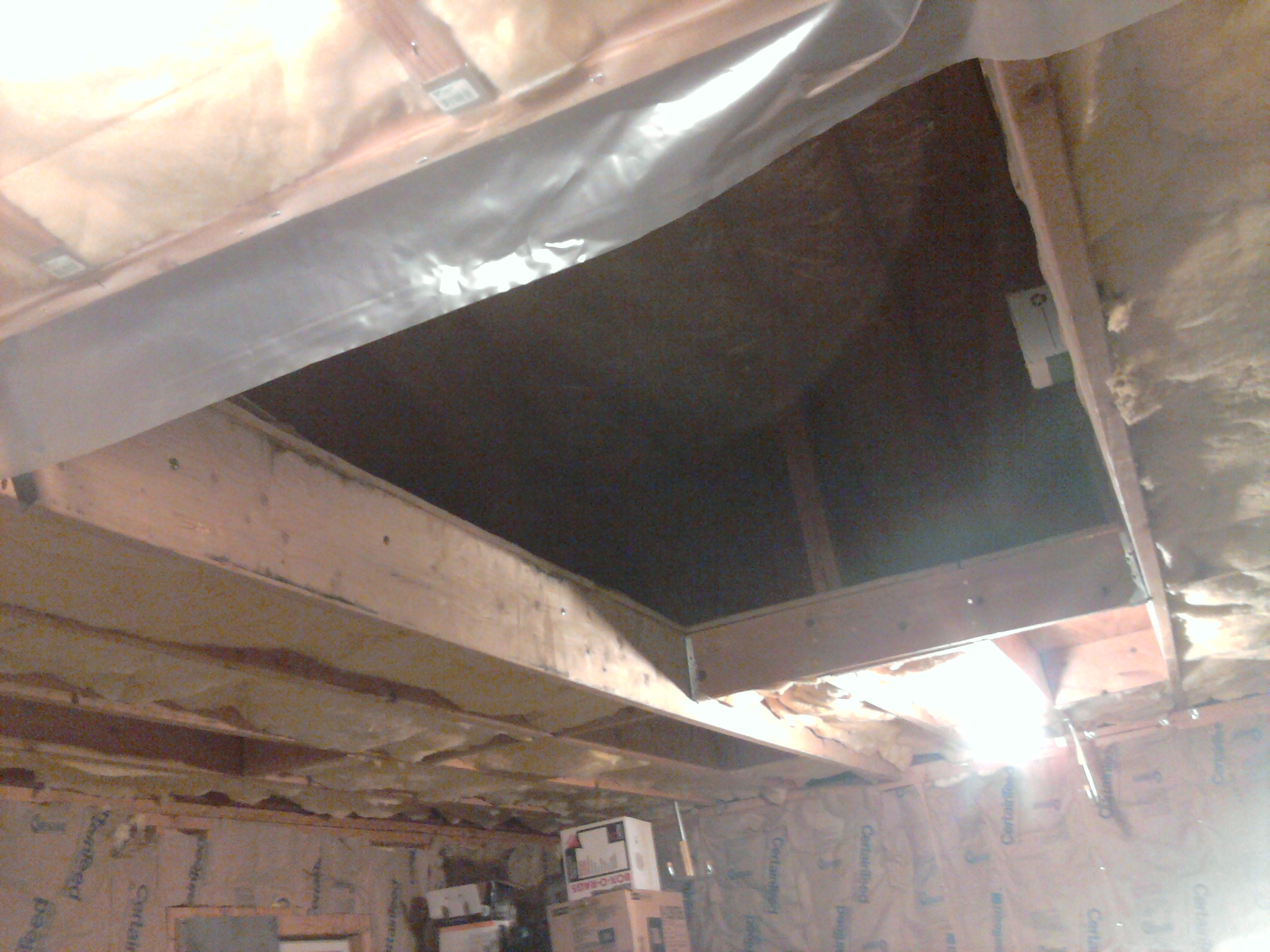 I also cut an access bay for the ceiling. There was some argument about whether or not the rafters could support the weight of drywall or anything on top of them, but I used my judgment and decided it was OK. I'll not be storing much in the upper area, but I do want access up there for some sheet goods and other storage. I'll eventually make a door for the bay so that is insulated as well.