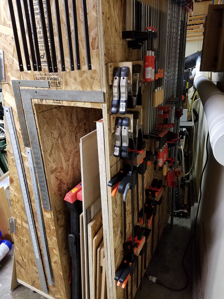 I made a mobile lumber storage cart that can store half-sheets in a rearward area, boards/offcuts up front, and then I added clamp storage to the back.