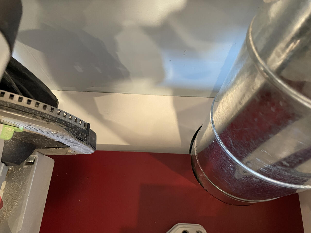 Ducting is 24 gauge spiral pipe from Menards and connectors from Oneida-Air and Rockler (Spiral Manufacturing). I'm not impressed with the Oneida connectors as they are spot welded and "sealed" with caulk. The Rockler ones have fully welded seams and are a much heavier gauge ... and twice the price as Oneida. I still need to tape the seams on all the drops but I want to get them fully secured to prevent damage to the tape seal. Nordfab quick connect was out of my price range (maybe for the next shop ). The main trunk is 8" with 4 6" drops. I plan to add a dust trough behind the Kapex because the 80% dust collection on the port just isn't good enough. I hate vacuuming around the Kapex UG cart.