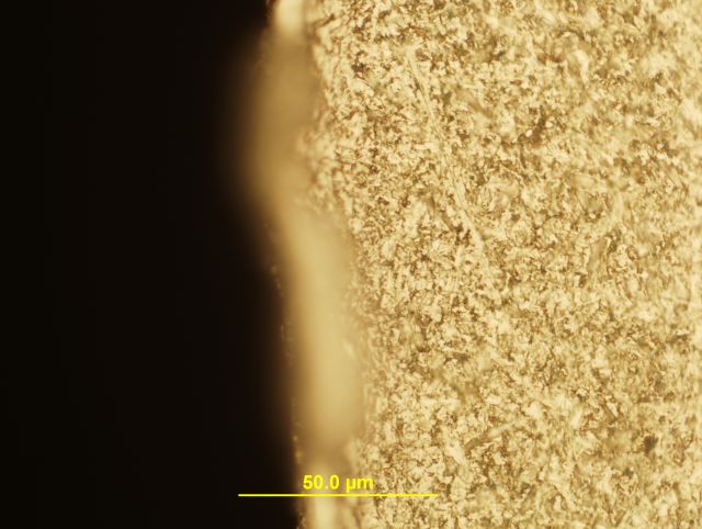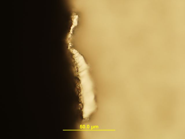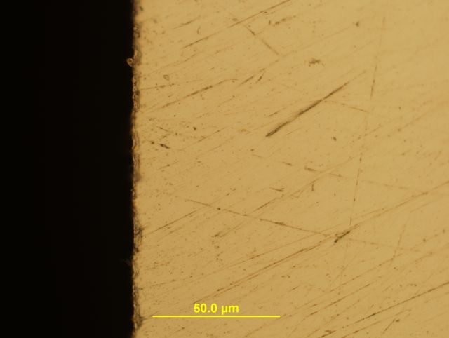 But, between that, and banging it into some edge grain, the edge is very quickly breaking down, as shown in the following three micrographs; the first one being low mag, the second (high mag) focussed higher up on an edge fold, and the third (high mag) being focussed on the backside: