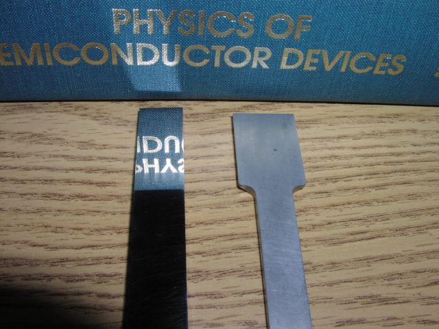 First, here's a photo of the backs of two blades. The 1/2" Marples chisel is on the left, and the lapped, but not yet polished medium shoulder plane (MSP) blade is on the right: