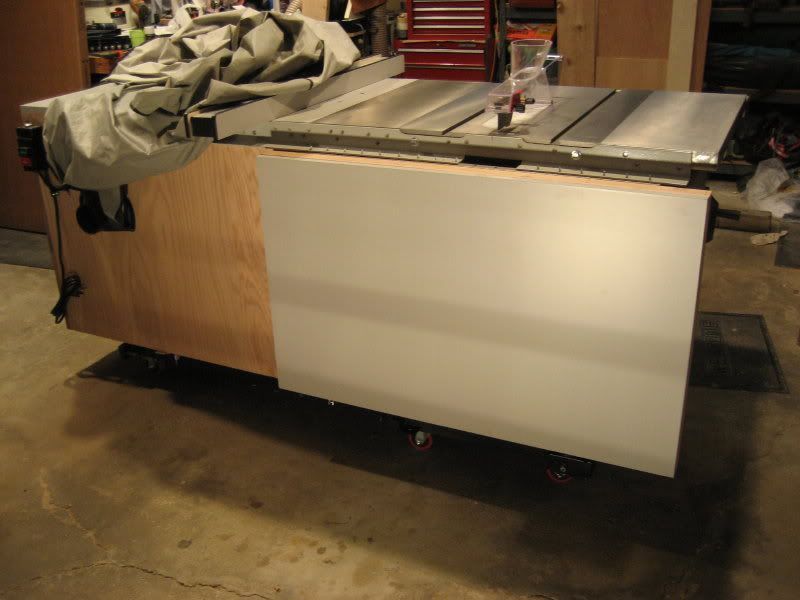 Only problems encountered was the fence was very tight against rails even with pads turned down. This caused the slick plastic pad to pop off the lever that locks fence. I am going to epoxy it back on. Getting the wings level was not fun. The Bench Dog wing was the easiest. The extension table was kind of a pisser. It has a really nice hard thick almost phenolic looking bottom with a layer of some substrate then a decent grey laminate top. All in all decent stuff, but then they used stupid pine to trim it out with white glue and 18 gauge brad nailer, 2 nails per joint! I will likely rebuild with maple or oak while salvaging the main top materials.