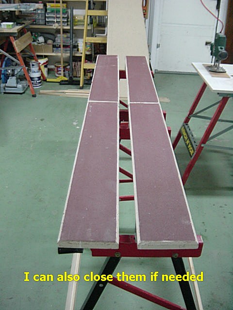 I swear by my Stanley FatMax aluminum horses. They are sturdy, each leg is individually adjustable for length, and they fold up flat when I'm not using them. I have a variety of "toppers" made to fit them, including sacrificial sawing boards, carpet-covered runners, and a couple different sized table tops. They are great!Last edited by Uncle Cracker; 09-02-2007, 08:19 AM.Comment
