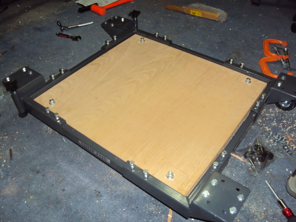 The mobile base for the saw was good and solid but "universal". The manual recommended sandwiching two pieces of 3/4" ply and bolting them into the stand. Here are the glued plies now.
