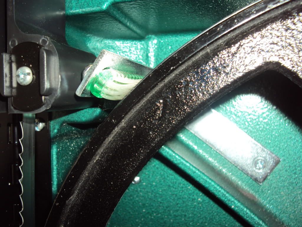 A large flat handled tooth brush from the drug store with its handle cut off was secured to an L-bracket with one screw and again with a bolt and lock washer. Then I drilled (sigh) through the side of the saw and bolted the bracket down, again with lock washers. Thanks to my wife for choosing the matching green toothbrush! Totally pro!