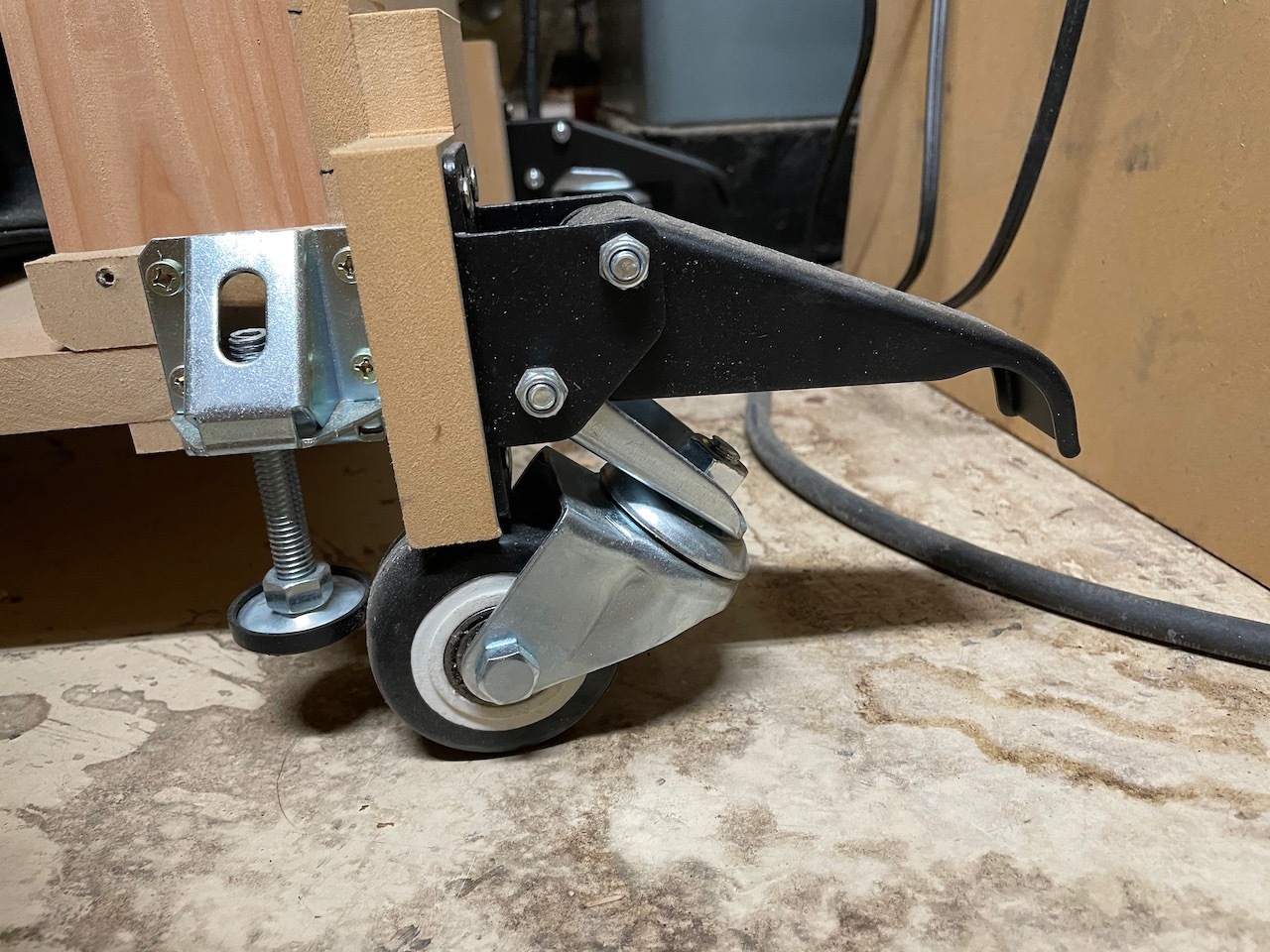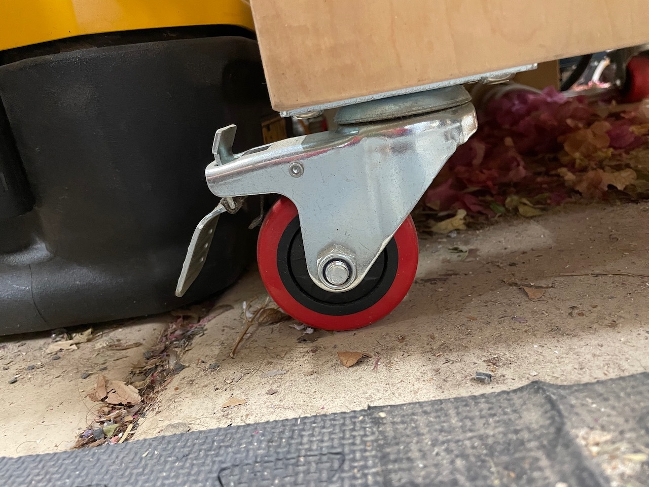 I did take look at the 'workbench castors' which don't engage the wheels unless called upon, but (a) they are expensive, (b) they take more floor space, and (c) they too are not guaranteed to work, see exhibit A below.