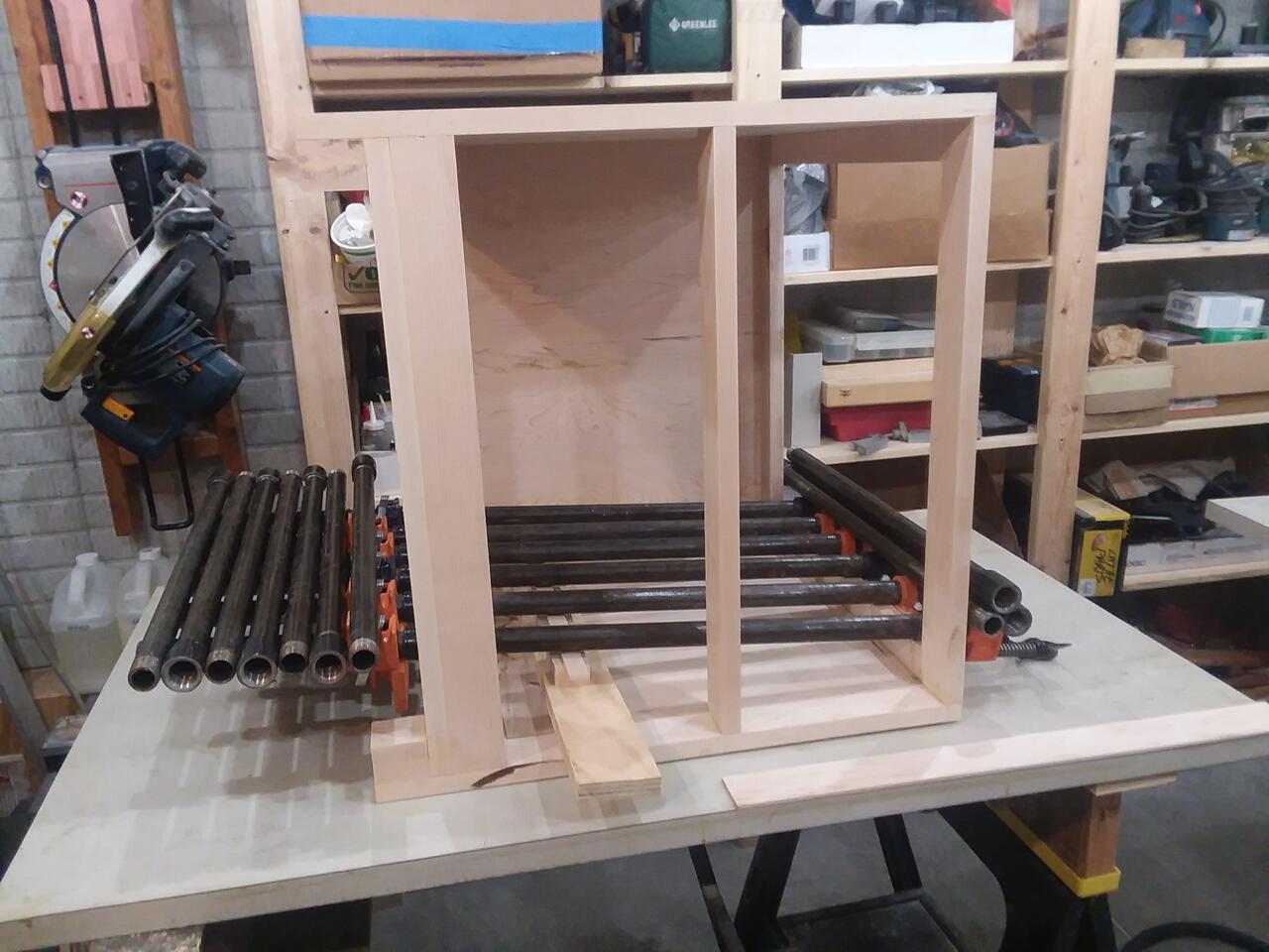 Due to a brain fade while assembling the carcass for the living room side table I'm making, I had to add 2" wide by 1/8" strips to the inside of one side of the cabinet to facilitate mounting the full extension drawer slides. I don't have any heavy weights to put on them and no way to use cauls, so I improvised using the Pony pipe clamps I have. Crude, but effective.
