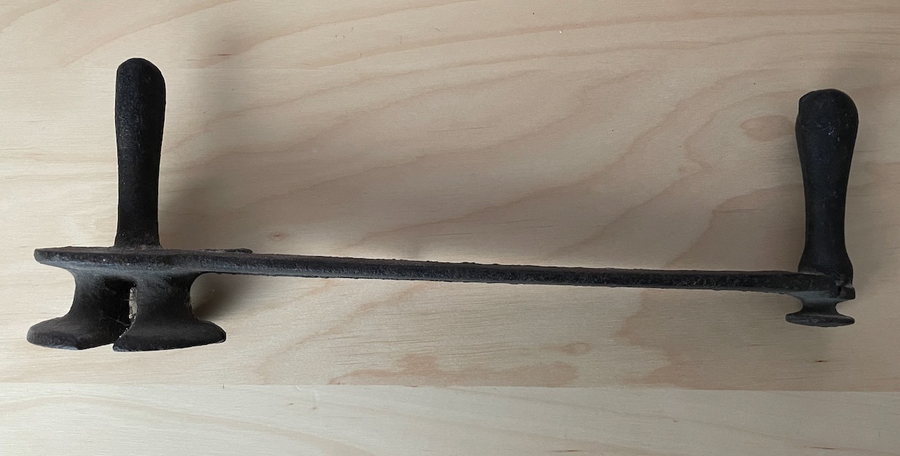 Looks like a tubing bender. It could very well be a round bar bender, as in 1/8,3/16, 1/4” rod. Real handy to build all manner of things with. Considering the distance between the 2 handles it was probably intended to bend box shaped rod for cages or baskets.Comment