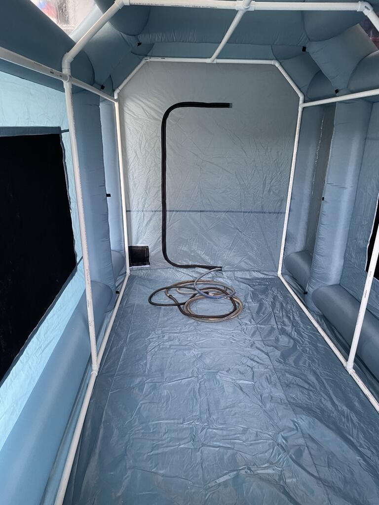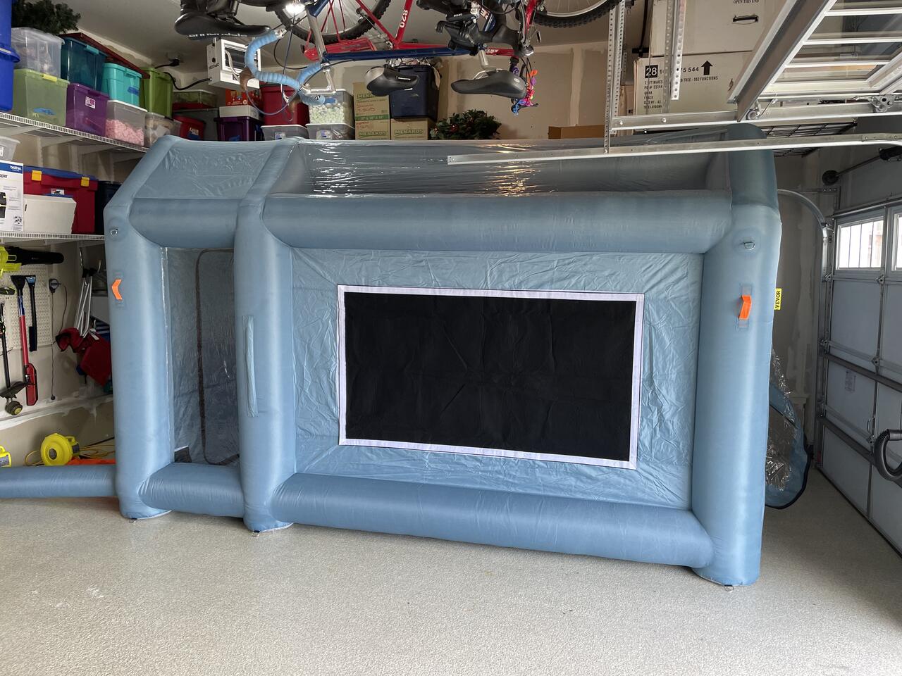 It came with two blowers, one for inflation and the second pushes air in through the carbon filter on the lower left of the door in the picture above. The large windows on the sides are also carbon filters to allow air to exhaust and to catch overspray. The hose on the floor is the air supply from my Fuji HVLP turbine.