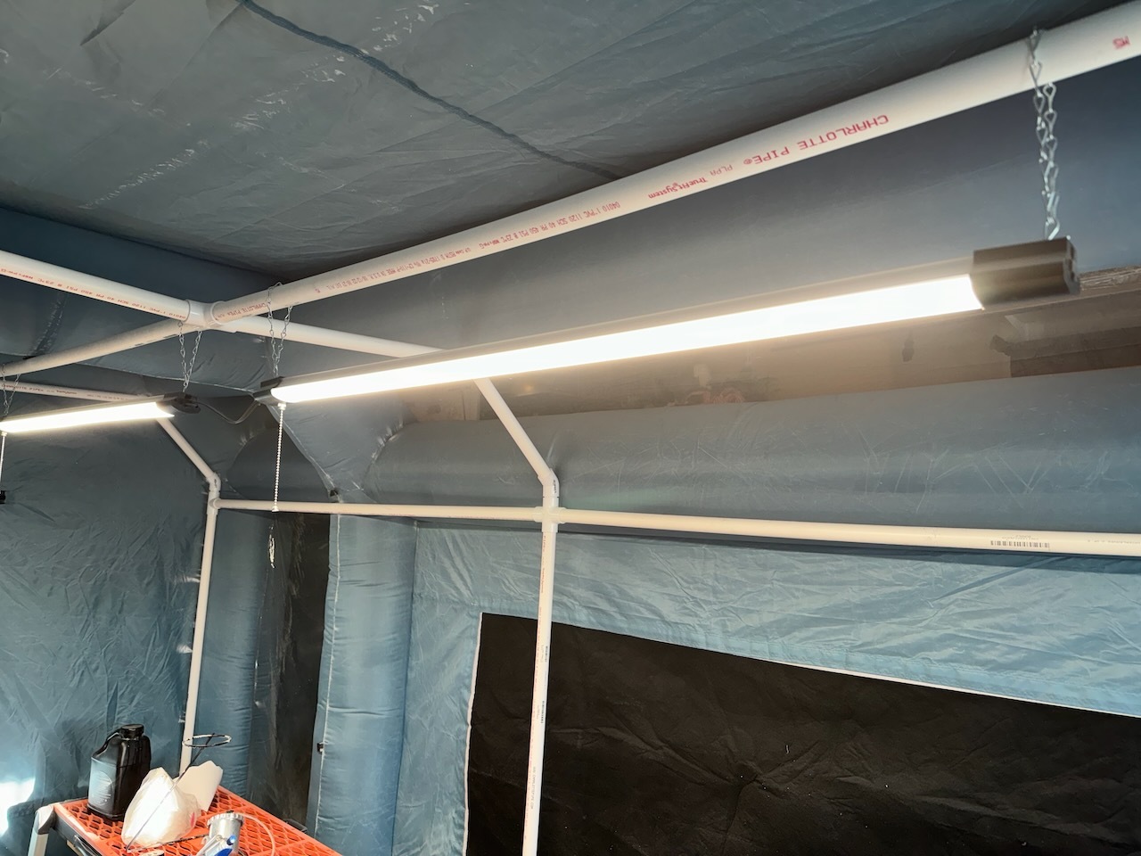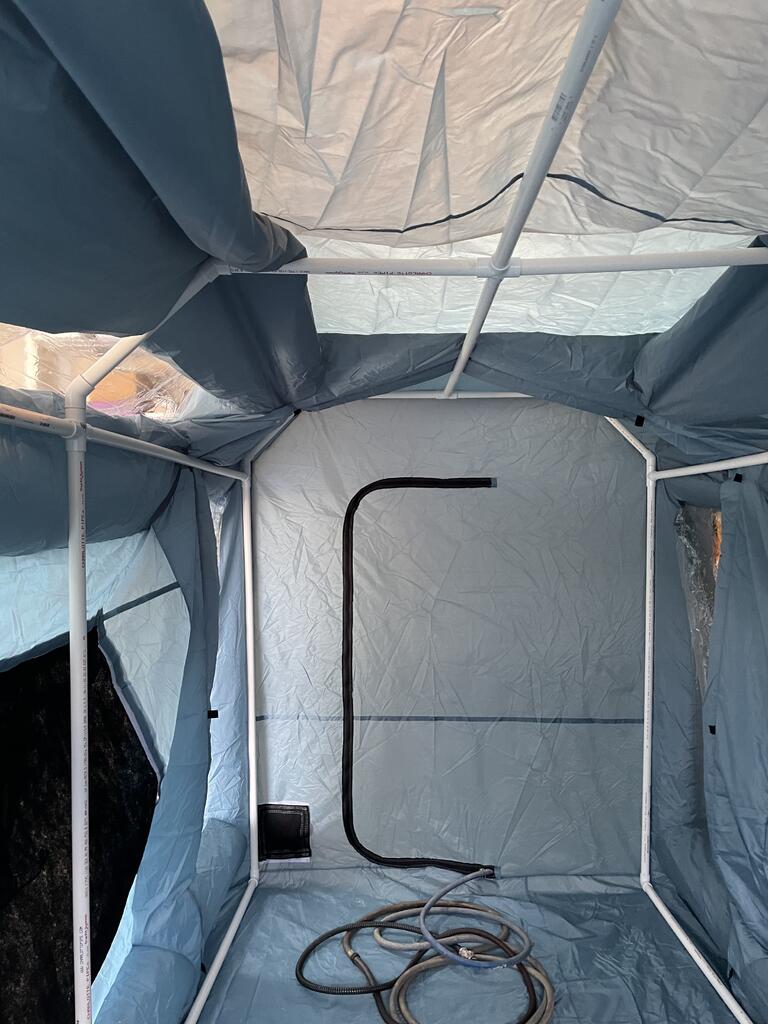 I bought an inflatable finishing room from Amazon and with some PVC pipe and a few connectors, it will stand up on its own. Finishing outside is tough with the constant wind and the finicky weather in Minnesota.