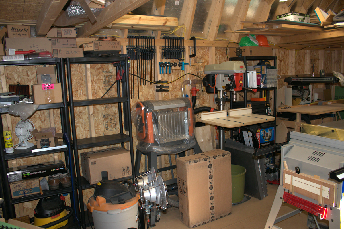 As can be seen in the two shop pictures, I use open shelves, and the tool cases that used to come with tool purchases fit nicely in either the overhead lofts at each end of the shed, or under the work benches.