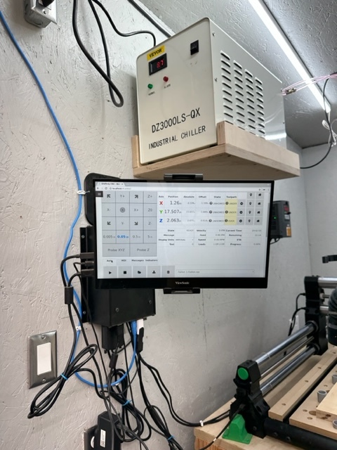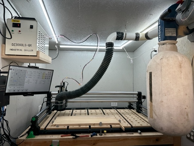 I bought a Onefintiy Journeyman cnc a couple of years ago. I had it running with a Makita palm router. A couple of weeks ago I purchased a water cooled spindle and a water chiller. Although the chiller is a bit of a misnomer as it’s doesn’t have any refrigerant. Just some coils to keep the liquid cool. But it does have an alarm that goes off if the flow stops. Other downside it’s kind of loud. But so the dc and carving running it kind of gets drowned out. Made a new spoilboard as well and a secondary spoilboard that I use for thru cuts. Not 100% satisfied with true design and I’ll definitely change it when I make a new one.