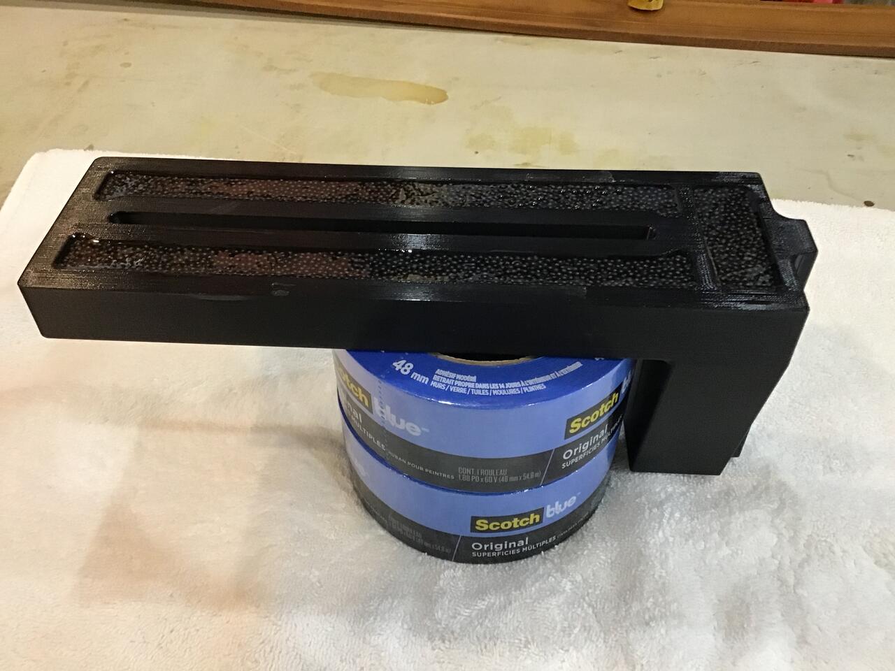 This is the 3D printed banjo with the recesses for the lead/epoxy infills. It weighs 15.9 ounces. I used my Dremel (Ryobi) hand tool with a dental burr to carve small keying reliefs into the sides of the recesses and etched the cavities by swabbing them with acetone.