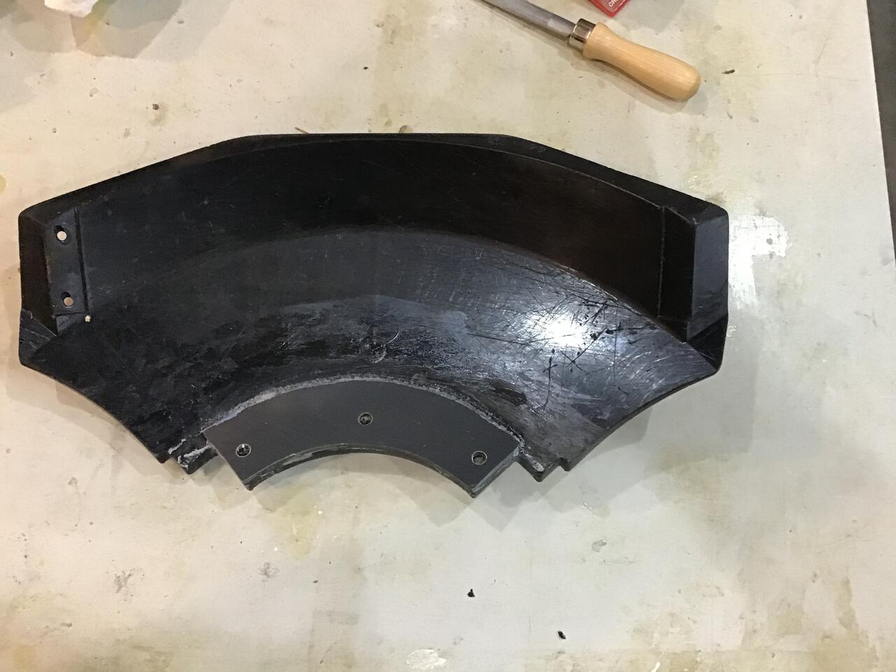 Step four. The plastic backing piece was cut 1/4" wider on the convex side and the backside was tapered to mate with the shield to further reinforce the repair. I bonded the backing piece to the shield with e6000. This glue cures somewhat flexible and I thought it would provide some vibration protection. All of the edges were cleaned up with files and sandpaper and the mounting holes were drilled out. The shield was mounted with new, longer bolts as the mounting base on the shield is now thicker. While I as at it, I sharpened the line cutter, and re-lubed the gearbox. Maybe the rebuilt trimmer will outlast me.