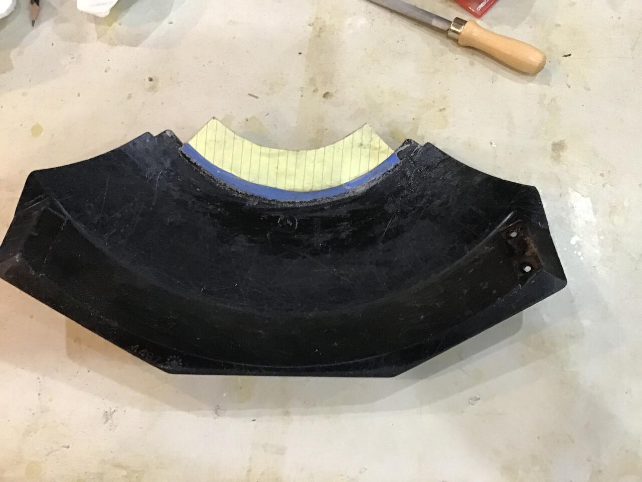 Step 3. I spent most of the day researching prescription insurance since our current provider just told us the premiums would be DOUBLING for next year. According to the carrier, it's due to the increased costs from tariffs. All carriers have doubled their prices for 2026. Anyway, I drilled out the three mounting holes in the shield from underneath so I could use them to drill out the add on plate I will add to the underside of the shield to reinforce the mend. I made a paper template and will use it to cut the plate from some 7/64" thick plastic I have as leftover from the shipping materials from my electric riding mower.