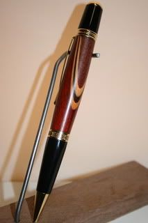 I bought a package of assorted veneers from LV, so I glued a few up with some Bloodwood and Purpleheart to make a blank. After cutting the blank at 10 degrees, I cut it into two and drilled it out for a pair of Sierras. I turned them both today and I am very happy with the results.