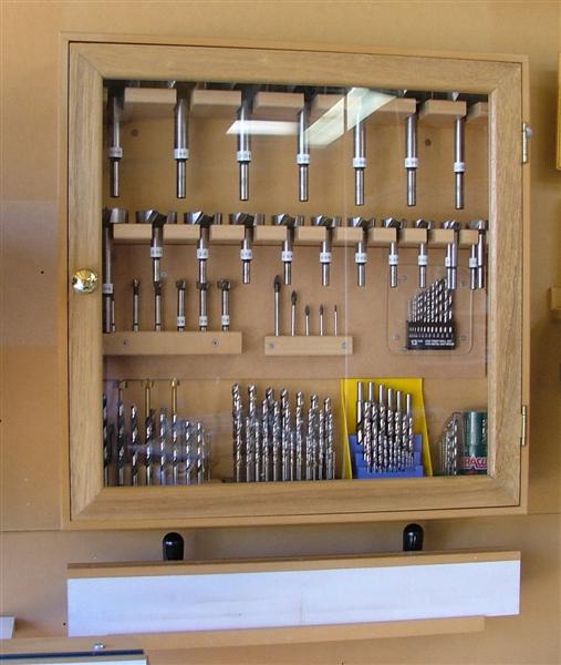 My Drill bit cabinet contains what you would expect – inch and metric bits, forstners, “spade” bits for glass/ceramics. The “stacked” forstners on the right have an 18mm and 30mm in front of the inch ones. My tall DP fence lives under the cabinet.