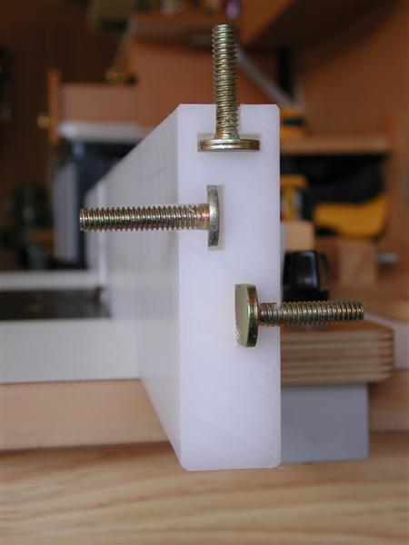 The DP table was also used on the old DP and I discovered the only easy way to attach it was to drill/tap ¼”-20 holes into the front of the OEM table (no holes!), and use a connecting piece of plywood from the 1-1/4” MDF spacer under the table. The spacer is there to allow clearance for the handle which raises/lowers the table.