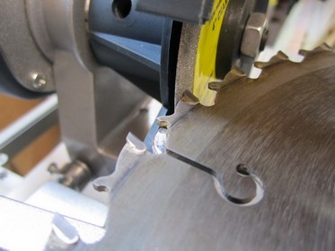 I found no instructions on how to grind the top of the carbide tip using the diamond wheel (the instructions said to use the included emery wheel). In fact, many instructions for home sharpening skipped the top of the carbide all together. If you watch Daniel's Youtube videos that I referenced above he shows a good diagram of why doing only face grinding or doing only top grinding results in a poor sharpening job or removes too much carbide, and why doing both face and top grinding is recommended. I've attached two pictures showing my setup for doing the top grind since I haven't seen that explained elsewhere. I needed to remove the grind wheel cover to get the clearance I needed, and I also needed to change the position the motor and blade support from the face-grind settings to get the correct top grind angle. I had a flat top blade, which simplified the settings, but if I had an ATB blade I could have adjusted the motor to grind the required bevels.